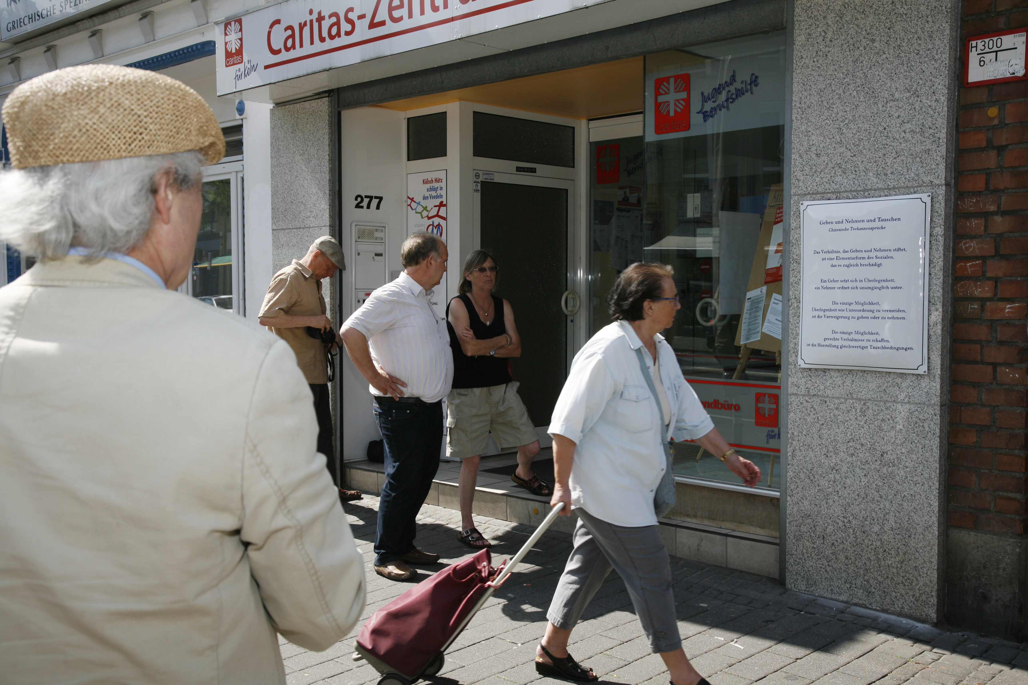 Die Tafel von Reinhard Matz am Caritas-Zentrum auf der Venloer sagt was Grundsätzliches über das Geben und Nehmen und Tauschen. Für die