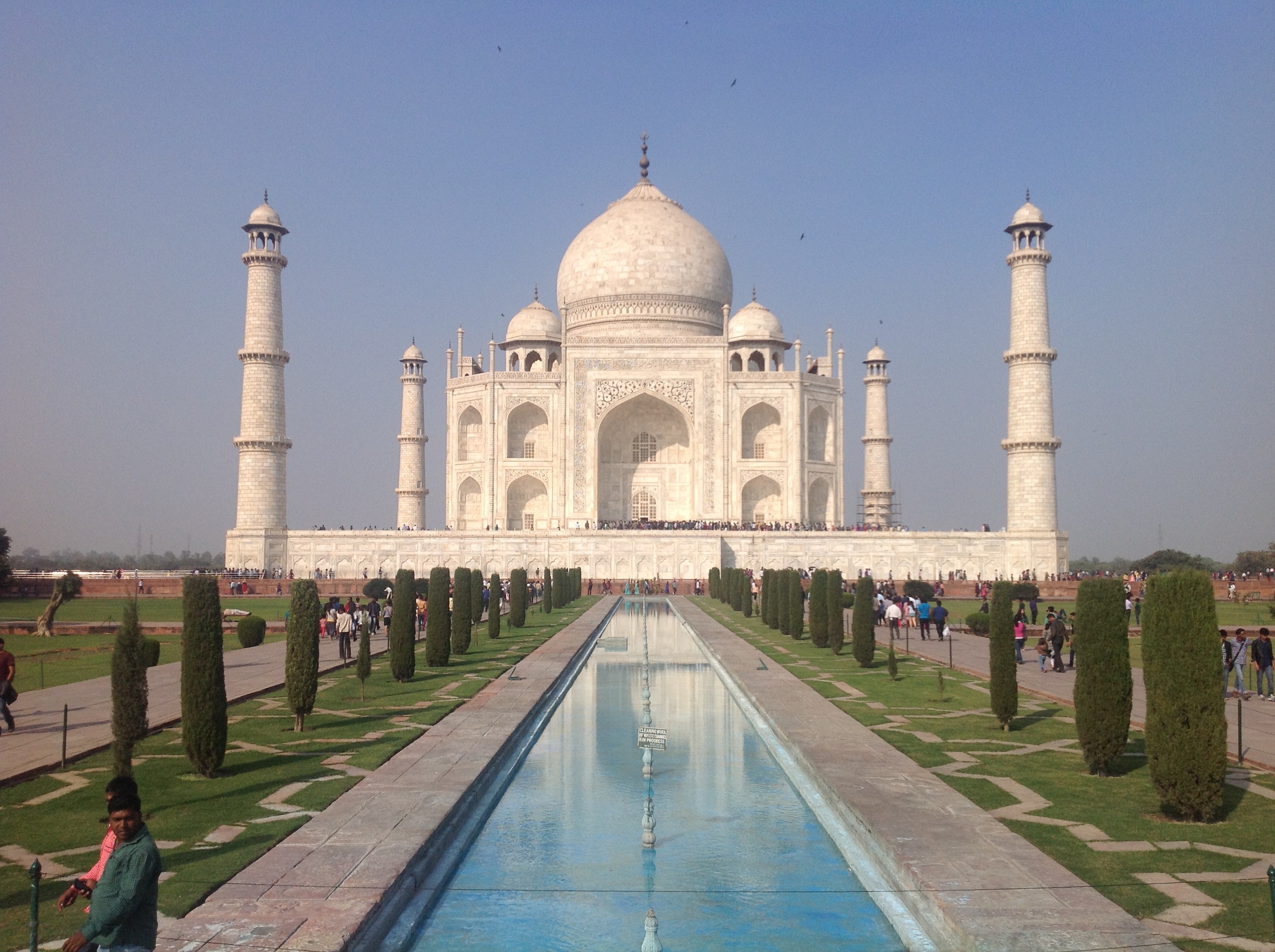 Der weiße Marmor glänzt in der Sonne. Die Kuppel des Mausoleums wird umrahmt von 4 Minaretten. Die perfekte Moschee als Grab des Moguls und seiner Lieblingsfrau. Perfekte Proportionen, perfekte Lage, unglaublich edel und schön gearbeiteter Marmor mit farbigen Intarsien. Zum Teil florale Muster, zum Teil Suren aus dem Koran. Trotz der vielen Intarsien wird das Gebäude niemals bunt, die Harmonie wird an keiner Stelle gestört und erst durch das perfekte Kunsthandwerk unterstrichen.