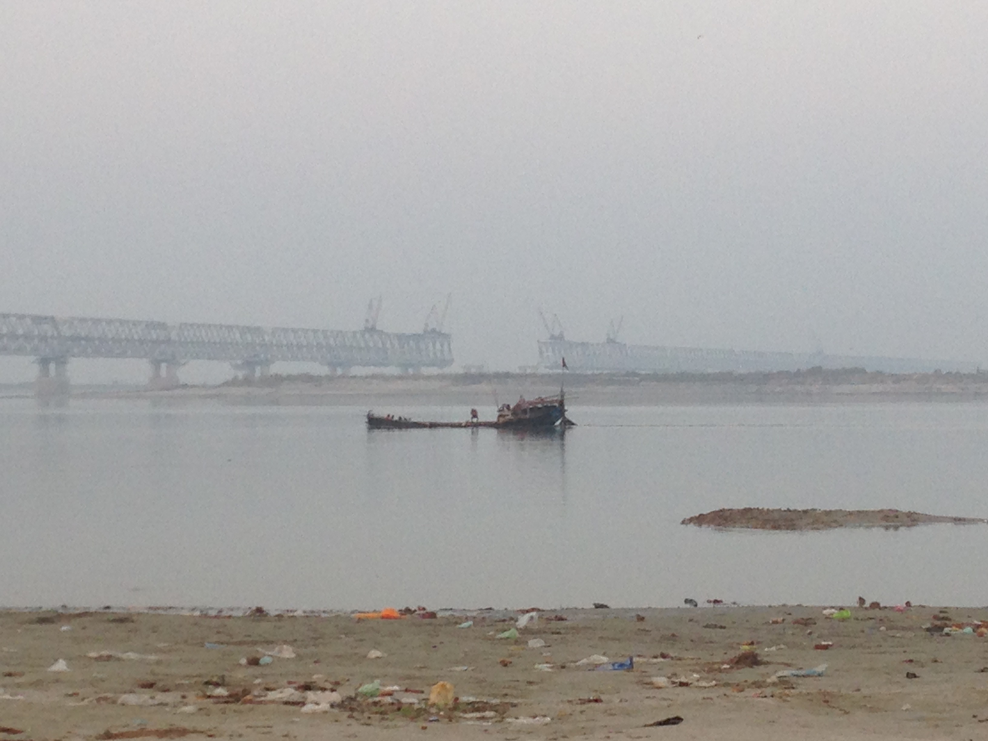 Der gewaltige Strom zieht sich träge durch die Ebene, die Brücke läßt Ahnung davon aufkommen, welche machtvolle Größe der Fluß einnehmen kann. Wir sind an einer Stelle, an der heute Morgen noch religiöse Handlungen der Hindus vollzogen wurden, und wir finden in den Überbleibseln des Morgens schöne Tongefäße für Räucherkegel und ähnliches. Schöne Erinnerungen an den Ganges.