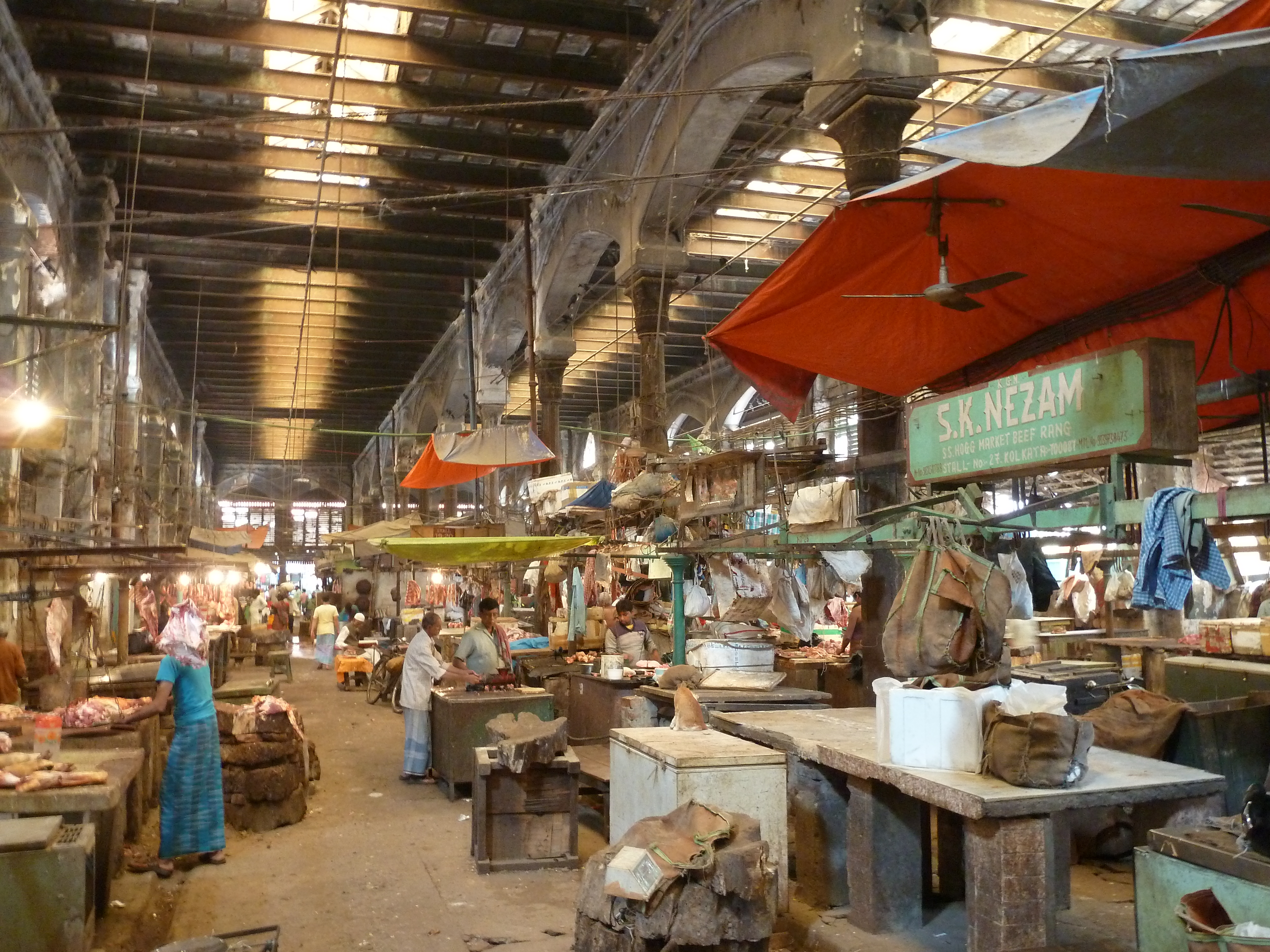 Ein bestialischer Gestank. Hier werden Tiere zerlegt, die Hygiene ist unsäglich, überall Laufen Katzen und Hunde herum, Dohlen und Krähen hüpfen, fliegen und picken in Abfällen. Sie sitzen auf irgendwelchen Stangen an der Decke und scheißen auf die Holzblöcke auf denen die Metzger hacken, es ist unvorstellbar schmutzig. Damit werde ich für diese Reise Vegetarier. No more meat in India.