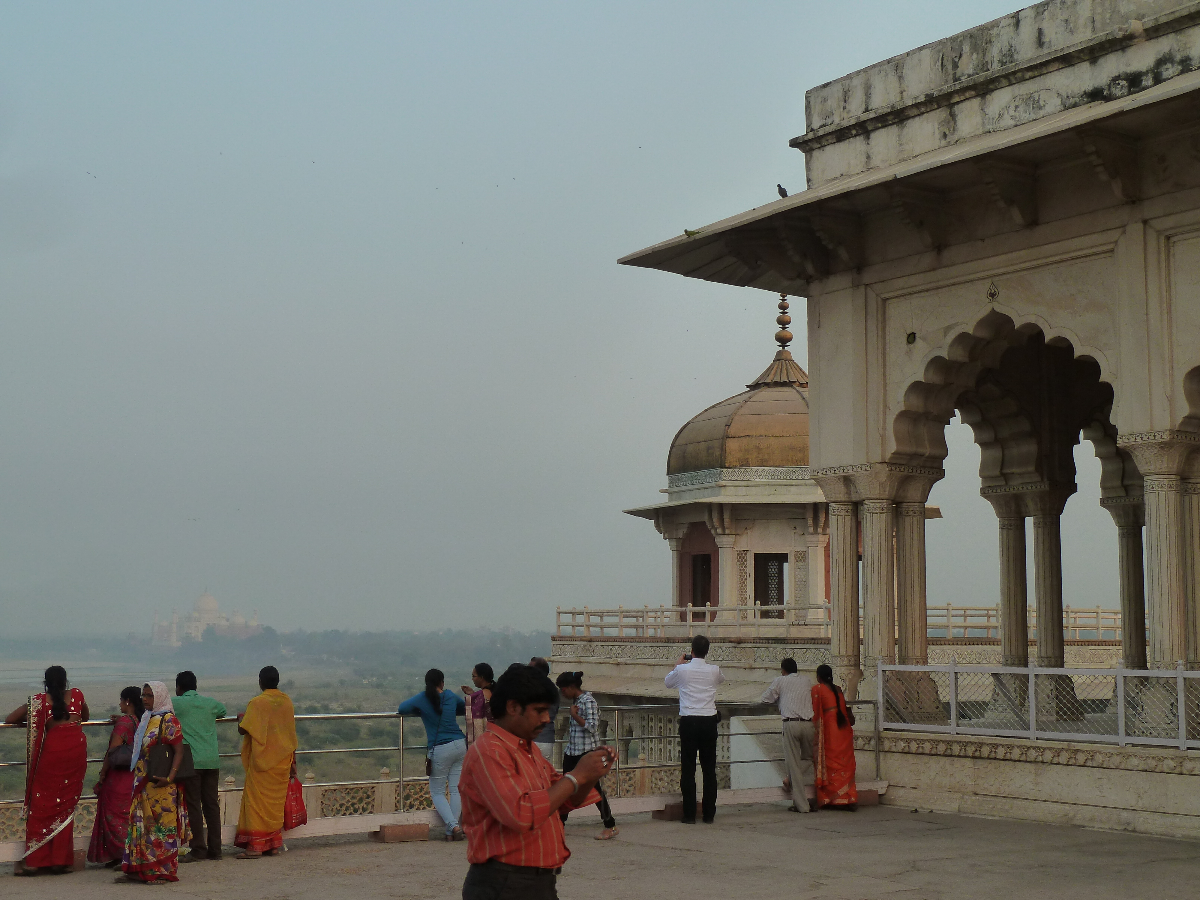 Eine wunderschöne Terrasse bietet einen atemberaubenden Blick über das Flußtal. In der Ferne schimmert das Taj Mahal in der Sonne.